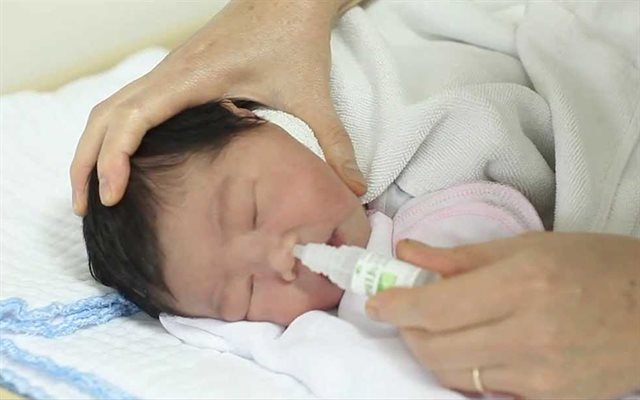Nhỏ từ từ từ 3-4 giọt nước muối vào hai bên mũi bé.