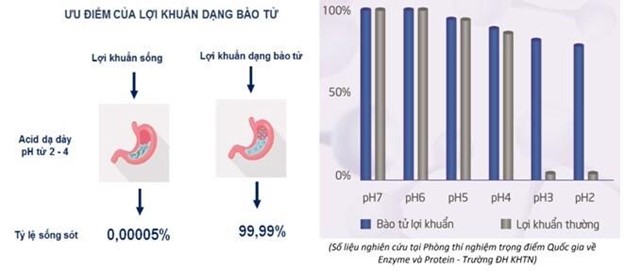 Khả năng sống sót cao: Bào tử lợi khuẩn có khả năng sống sót cao hơn trong môi trường khắc nghiệt của dạ dày.