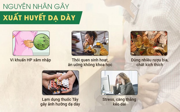 Vi khuẩn Hp, lạm dụng thuốc kháng sinh, ăn uống không lành mạnh, căng thẳng kéo dài đều là nguyên nhân có thể gây ra các tổn thương trên niêm mạc dạ dày và dẫn tới xuất huyết.