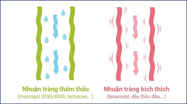Thuốc nhuận tràng thẩm thấu: Lactulose, Sorbitol, Bisacodyl làm giảm hấp thu nước ở thành ruột, tăng lượng nước trong lòng ruột, giúp phân mềm hơn và dễ tống ra ngoài.
