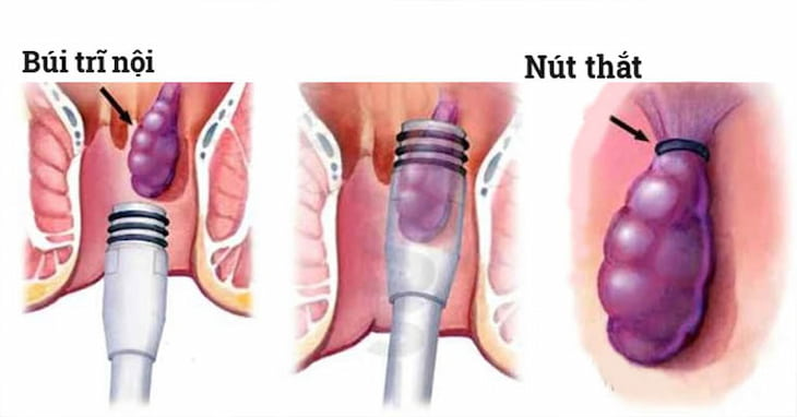 Một sợi dây thun hoặc vòng cao su được sử dụng để thắt chặt gốc búi trĩ, ngăn chặn dòng máu đi tới.