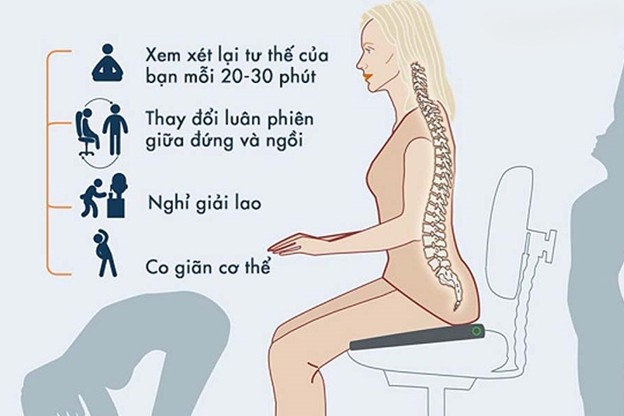 Khi ngồi: Ngồi thẳng lưng, vai thả lỏng, hai chân đặt phẳng trên sàn hoặc trên gác chân, đầu gối hơi cao hơn hông. Nên sử dụng ghế có hỗ trợ lưng dưới hoặc đặt một chiếc gối nhỏ. Đứng dậy nghỉ ngơi và đi lại sau mỗi 30-60 phút nếu phải ngồi lâu.