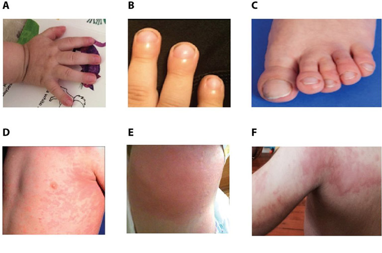 Bệnh thường gây sốt cao và phát ban dai dẳng, xuất hiện trên thân, cánh tay và chân khi sốt tăng đột biến.