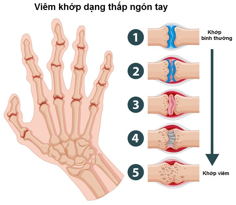 Viêm các khớp ở bàn tay: sưng tối thiểu một nhóm trong số các khớp cổ tay, khớp liên đốt gần, khớp gốc ngón tay.