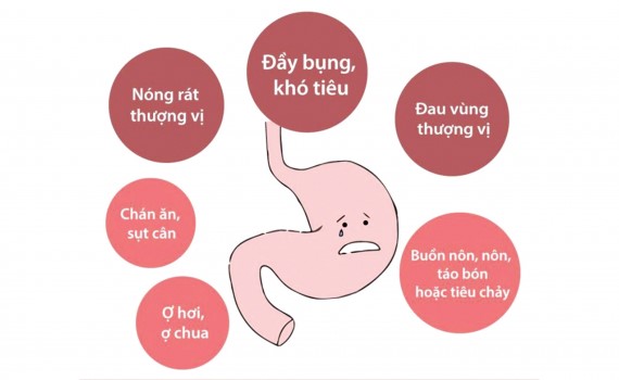 Rối loạn tiêu hóa, ăn chậm tiêu, chán ăn, đầy hơi, chướng bụng, sôi bụng, ợ hơi, ợ chua.