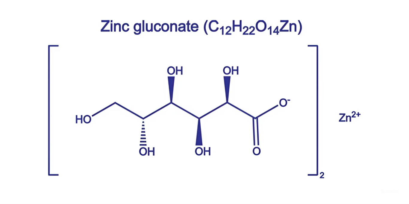 Muối kẽm gluconat là một dạng muối hữu cơ, tạo thành nhờ phản ứng lên men. So với dạng vô cơ như kẽm sulfat, nó có thời gian sử dụng dài hơn và ít tác dụng phụ hơn.
