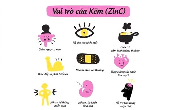 Vai trò của kẽm đối với cơ thể bao gồm: