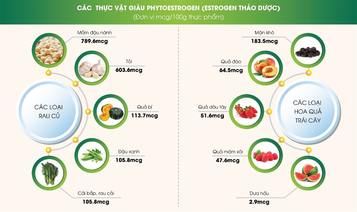 Thực phẩm bổ sung estrogen thực vật: Phytoestrogen có hoạt động và tác dụng tương tự như estrogen trong cơ thể, có nhiều trong một số loại thực phẩm như: Hạt lanh, các loại đậu, ngũ cốc, rượu vang đỏ, quả mọng...