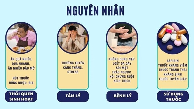 Ăn uống không hợp lý: Ăn quá nhanh, ăn quá no, sử dụng thực phẩm nhiều dầu mỡ, cay nóng hoặc uống rượu bia.