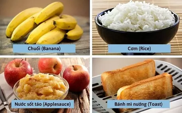 Chế độ ăn BRAT: Gồm chuối, cơm, táo (sốt táo) và bánh mì nướng, các thực phẩm này dễ tiêu hóa và giúp làm dịu dạ dày.