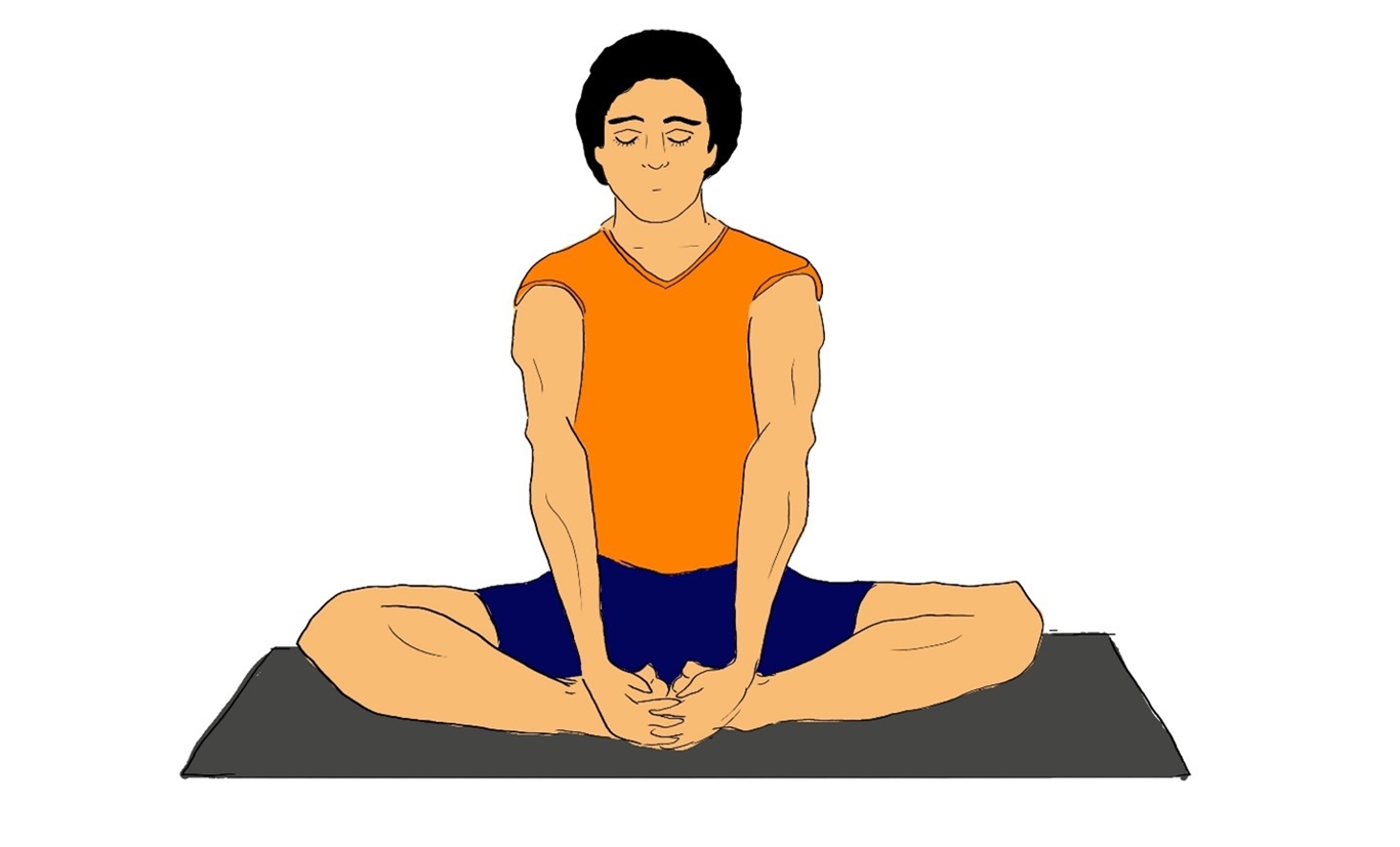 Thực hiện: Ngồi trên sàn, gập hai chân lại, cho lòng bàn chân chạm nhau. Giữ tư thế và nhẹ nhàng ấn đầu gối xuống.